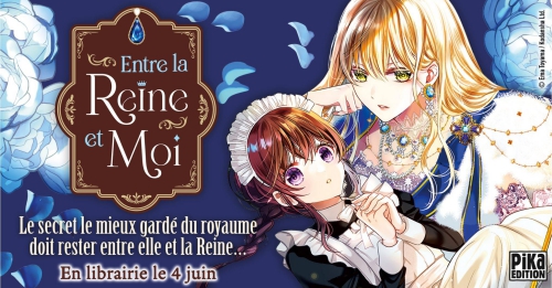 Scénario & Dessin : Ema Toyama _ Entre la Reine et moi _ Titre original : Majo Maid wa Joō no Himitsu o Shitteiru. (魔女メイドは女王の秘密を知っている。) _ Traduction : Oriale Faulhaber _ Édition Pika, Collection Shôjo _ Parution le 4 juin 2025 _ Inédit, poche, sens de lecture japonais, 160 pages _ 1 tome tous les 3 mois _ 7,20 euros (papier) 4,49 euros (numérique)