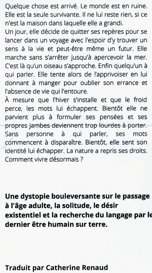 "Un roman post-apocalyptique sur la solitude et le pouvoir de la Nature qui qui prend le dessus quand la civilisation s’effondre."